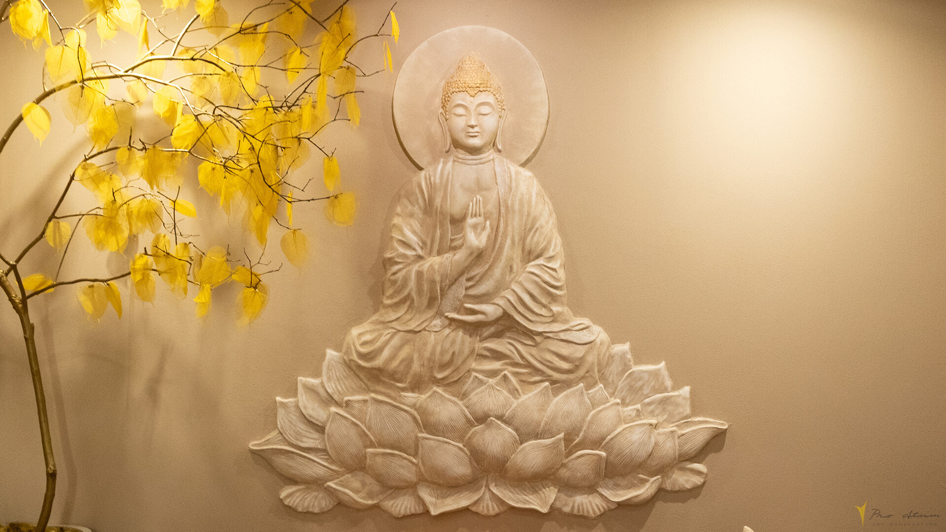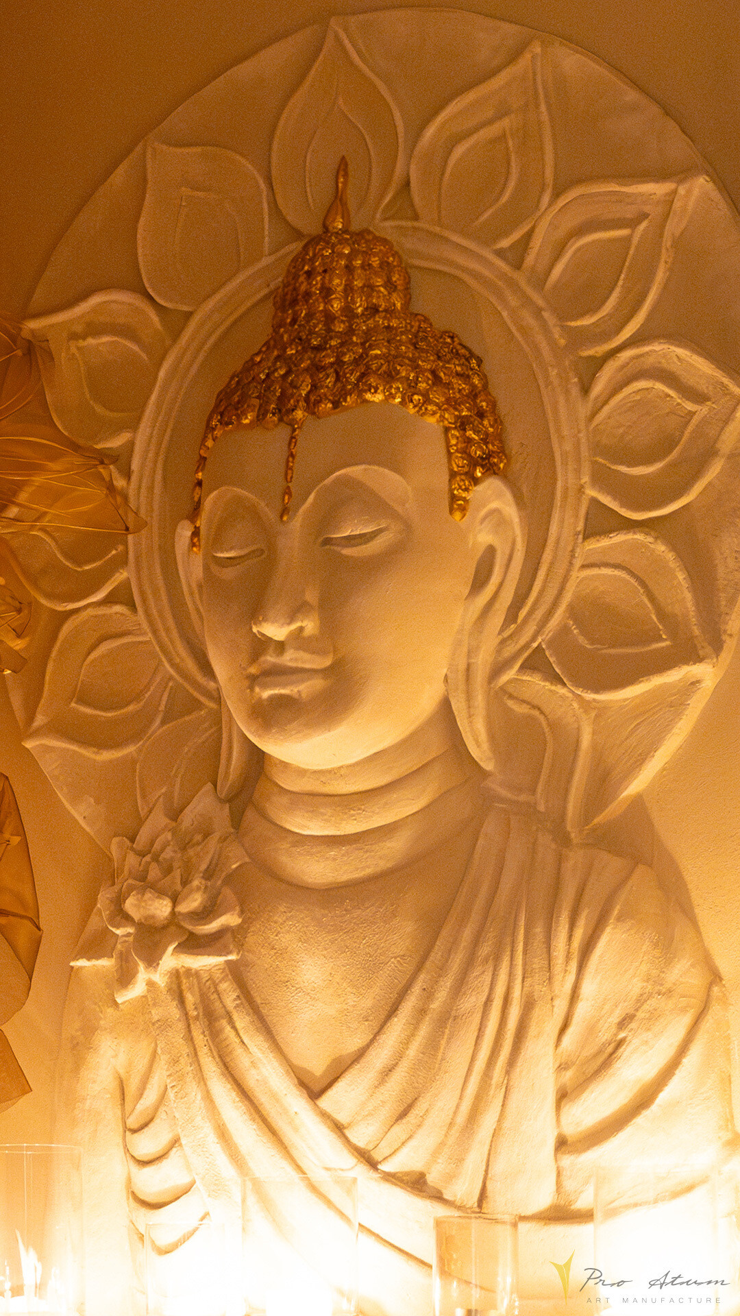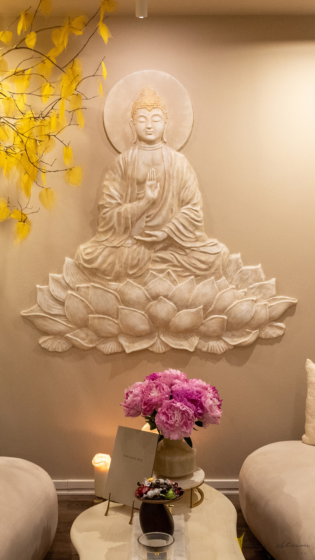 W delikatnym uścisku płatków lotosu, Budda zanurza się w głębokiej medytacji, a subtelne rzeźbione linie tworzą aurę spokoju i duchowej harmonii. Jego wyraz twarzy, pełen cichej mądrości, zdaje się przenikać granice czasu, zapraszając obserwatora do chwili refleksji i wewnętrznego wyciszenia.