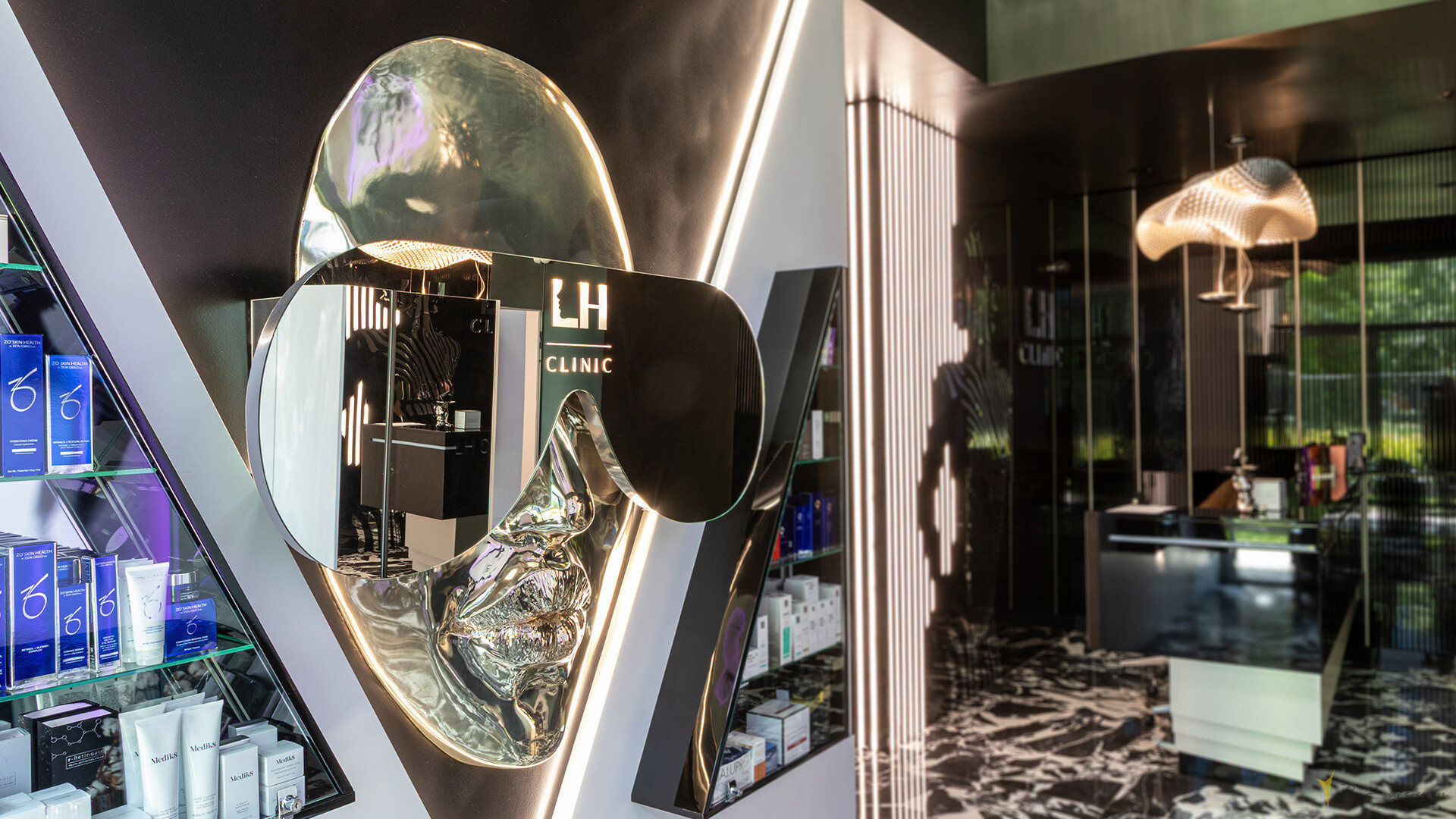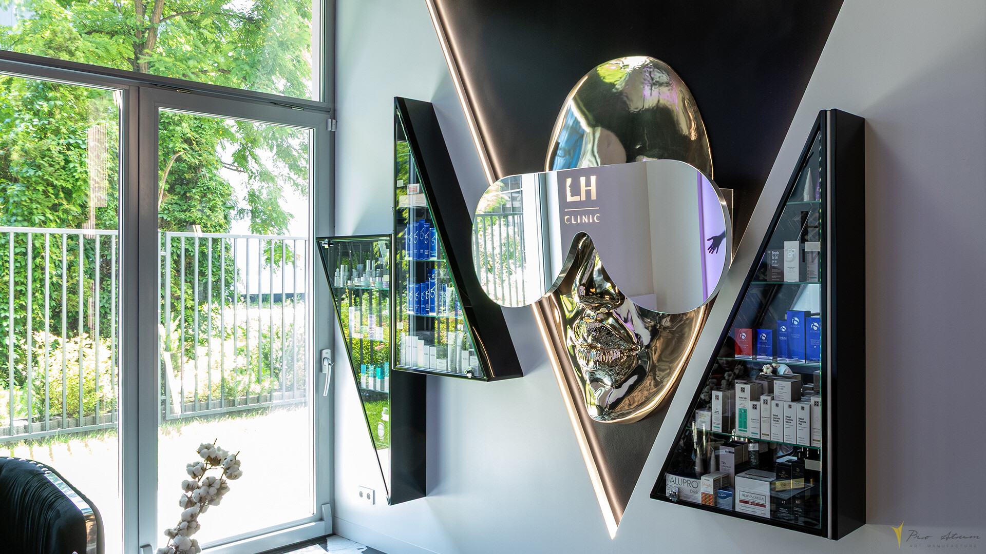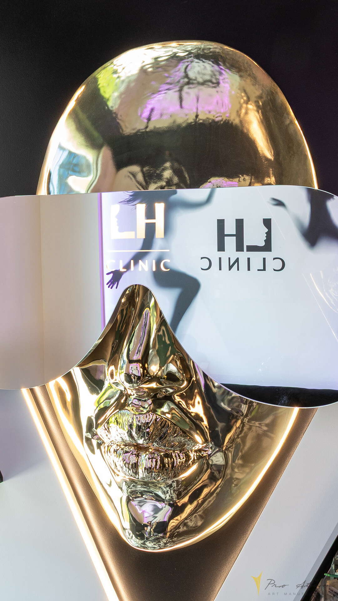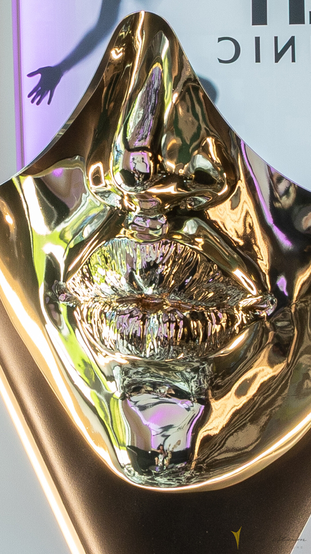 Na wypolerowanej powierzchni materiału odbija się perfekcyjnie wykuta kobieca twarz. Chromowana poświata podkreśla jej wyrafinowane rysy, a para stylowych okularów dodaje nowoczesnego, intelektualnego uroku, tworząc fascynującą symbiozę między klasyczną elegancją a futurystycznym blaskiem.