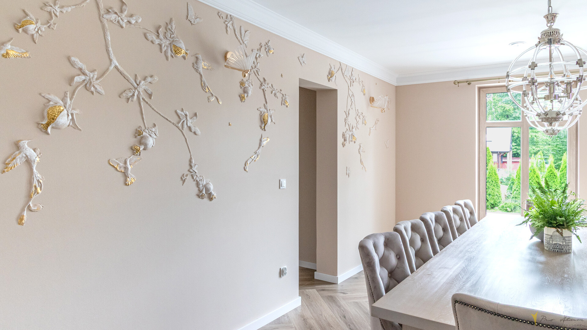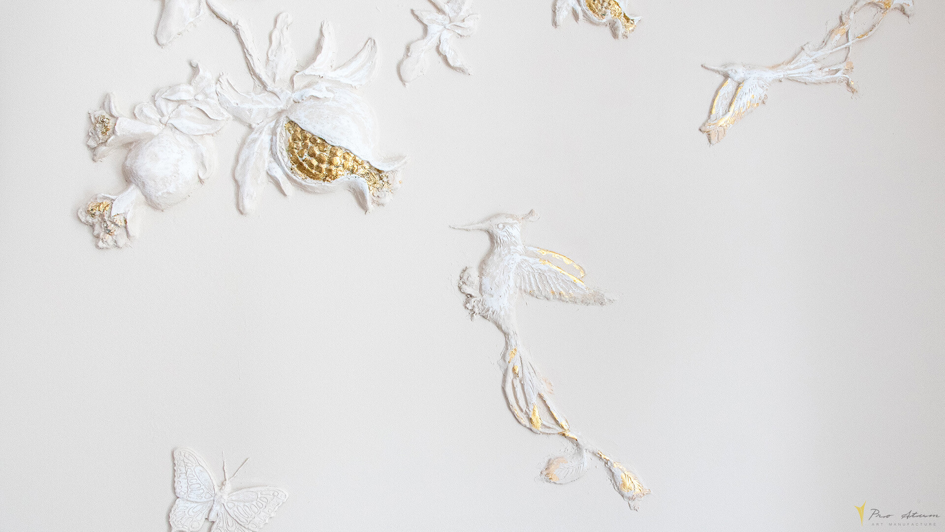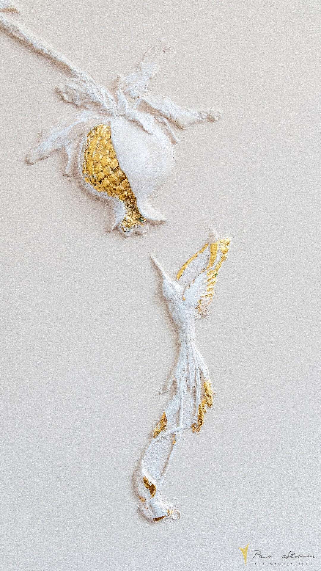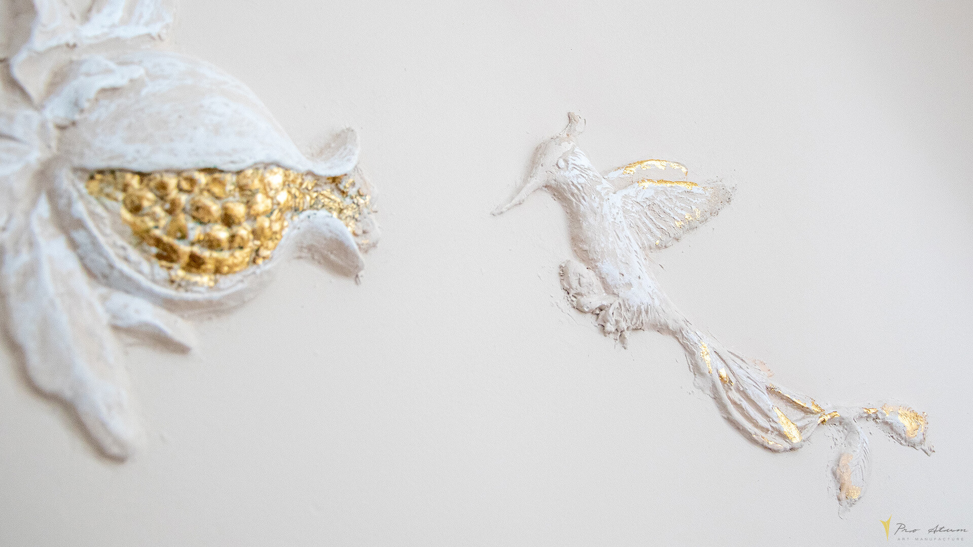W tej pełnej lekkości płaskorzeźbie grupa kolibrów unosi się w wiecznym tańcu pomiędzy rozkwitłymi kwiatami. Ich skrzydła, zatrzymane w ruchu, zdają się drżeć od energii życia, a delikatne kielichy kwiatów otwierają się na ich dotyk. Całość emanuje harmonią natury — migotliwą, ulotną i pełną cichego zachwytu.