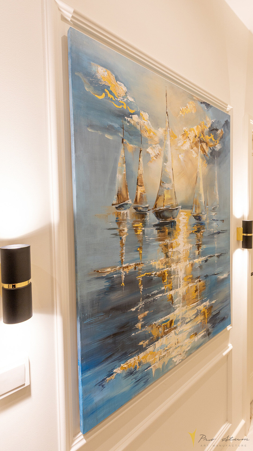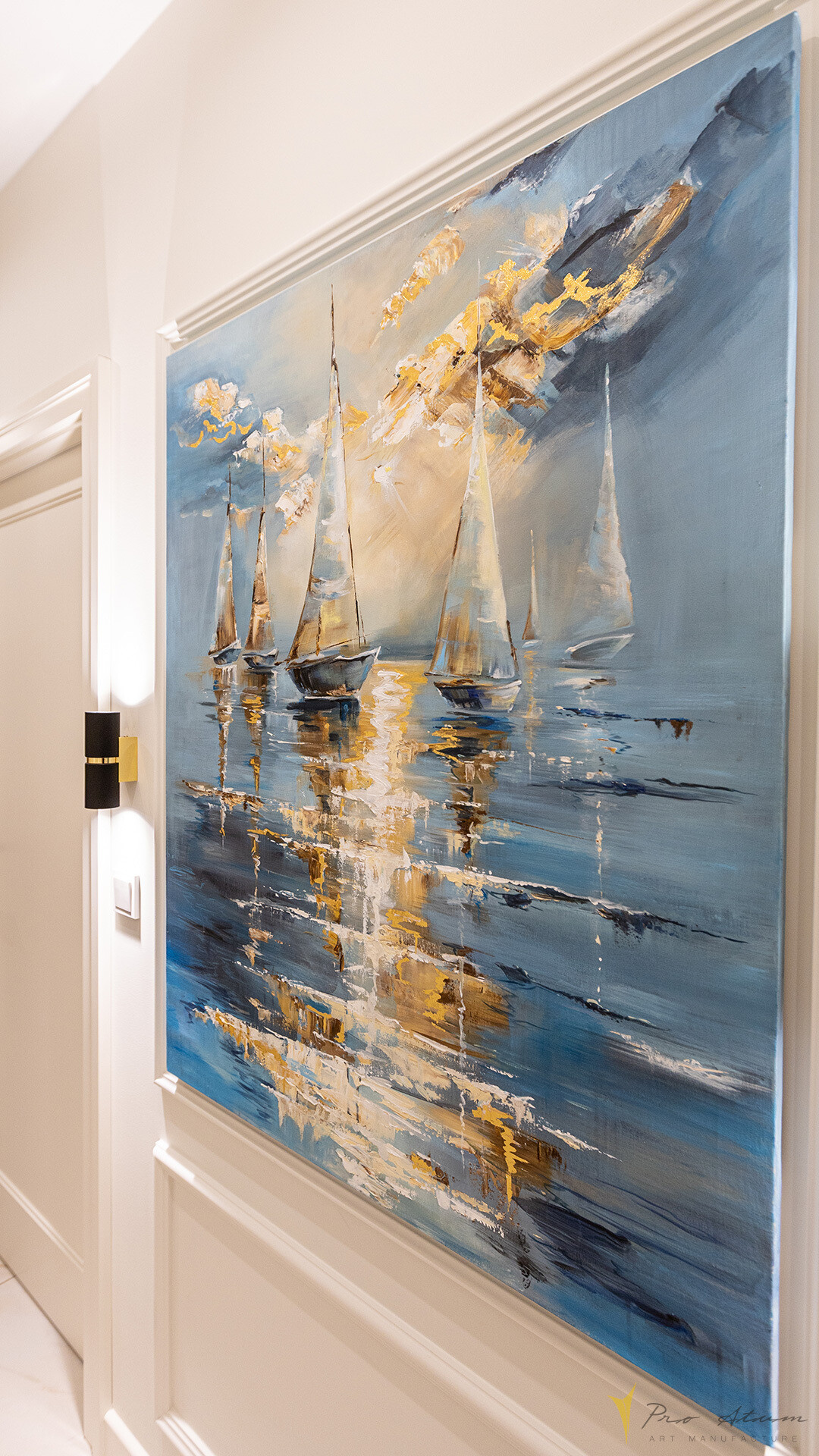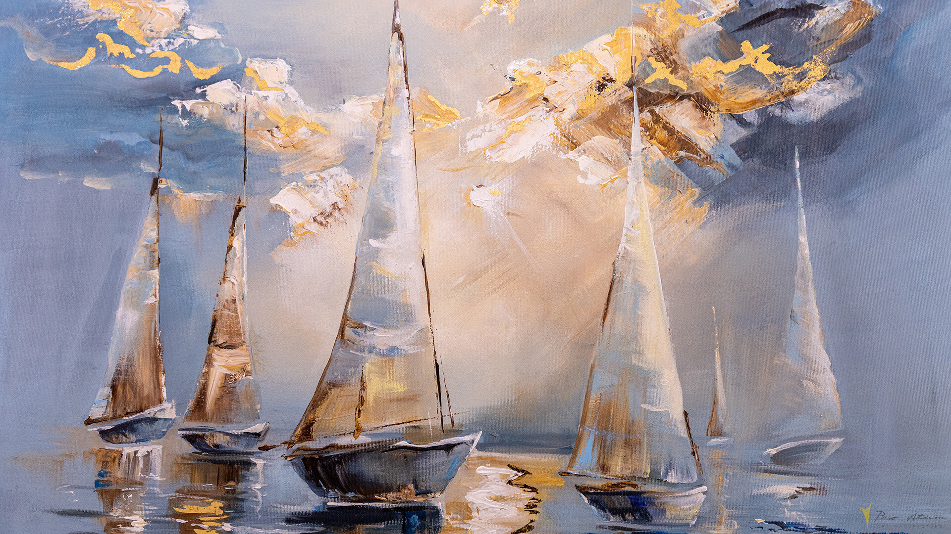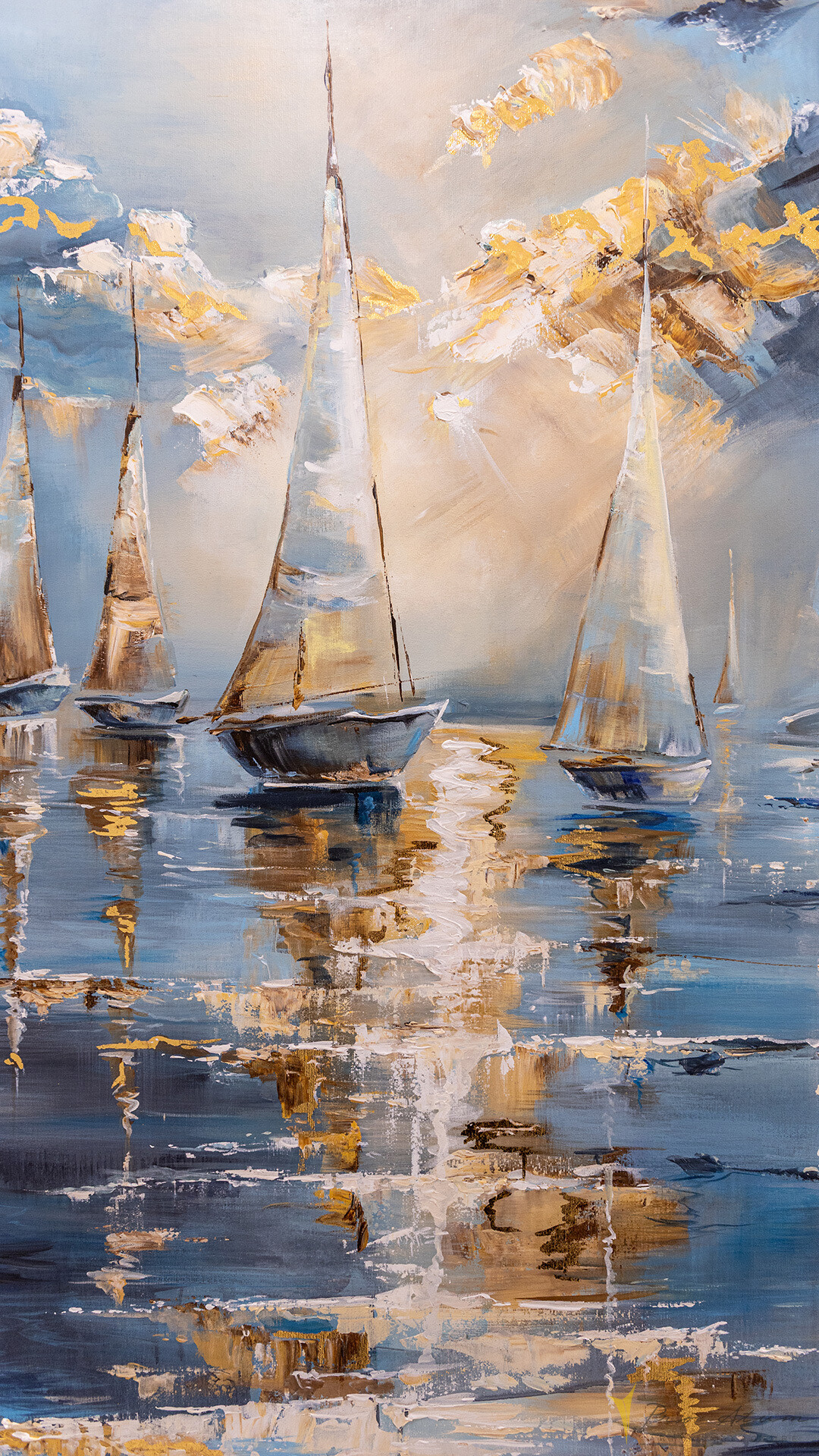 Na tafli spokojnej wody unoszą się żaglówki, ich białe żagle łapią wiatr niczym skrzydła wolności. Pociągnięcia pędzla oddają rytm fal i ciepło słońca, tworząc obraz pełen lekkości i nostalgii. To chwila zaklęta w barwach – opowieść o podróży, ciszy i przestrzeni, gdzie horyzont staje się marzeniem.